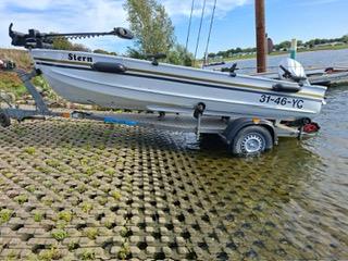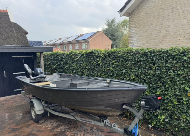 Crescent vis/toerboot (4,60x1.80). Compleet met 4 takt Honda 15 pk BBM met elektrische start, laadspoel en elektrische tilt functie. Inclusief trailer met lier, lichtbalk en twee nieuwe banden. Heeft boordverlichting en een bimini top. Komt met inventaris zoals accu, kunststof benzinetank, zitkussens, twee draaibare visstoeltjes, hengelsteunen, ankers (te bedienen vanuit de kuip), fenders, reddingsvesten, touwwerk, Stazo veiligheidsslot, zwemtrap, steun voor de electromotor, boordgereedschap, brandblusser, antislipvloer en afdekzeil.