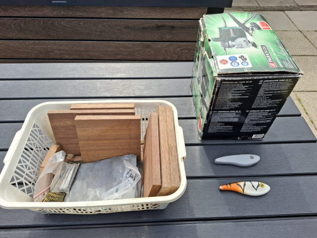 Mooi setje voor wie wil beginnen met het zelf bouwen en spuiten van jerkbaits. De aanbieding bestaat uit een complete airbrushset (compressor, spuitmond en verf) en grote hoeveelheid meranti-plankjes op jerkbaitformaat. Er zitten ook een paar voorbeeld jerkbaits bij die je als mal kunt gebruiken en diverse materialen voor het uitloden en afwerken van jerkbaits. Het geheel is amper gebruikt en mag weg voor 65 euro.